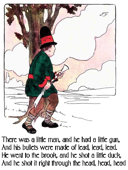 Ho ho, how we laughed. Now, this might just be a child's rude parody of the duck-shooting rhyme, but I have come to understand that children's rhymes - and I mean real, folk-lore children's rhymes - usually have their origins in some political or historical theme, and often it is pretty strong stuff - e.g. nursery rhymes which are allegories for the Black Death, the burning of Catholics and other fun topics. I don't believe that the little man with his little gun is as sinister as that, but it has been suggested to me that the skipping song is a military satire based on the duck-hunter, and may come from the Boer War or some other British Colonial War. I have no idea, but since I know of no more erudite bunch than the readers of this blog, I'd be delighted if anyone can shed a little light. If it helps, the illustration at the top dates from 1912 or so, so the duck-hunter rhyme has been around for as long as you like. Who was the little man, and what was he doing?