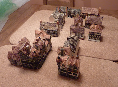I previously gave a glimpse of some of my new Tey Pottery houses - this little side-project is shaping up very nicely, and I have the makings of a presentable 17th Century English town centre, such as I can lay siege to. So here's a slightly bigger glimpse...