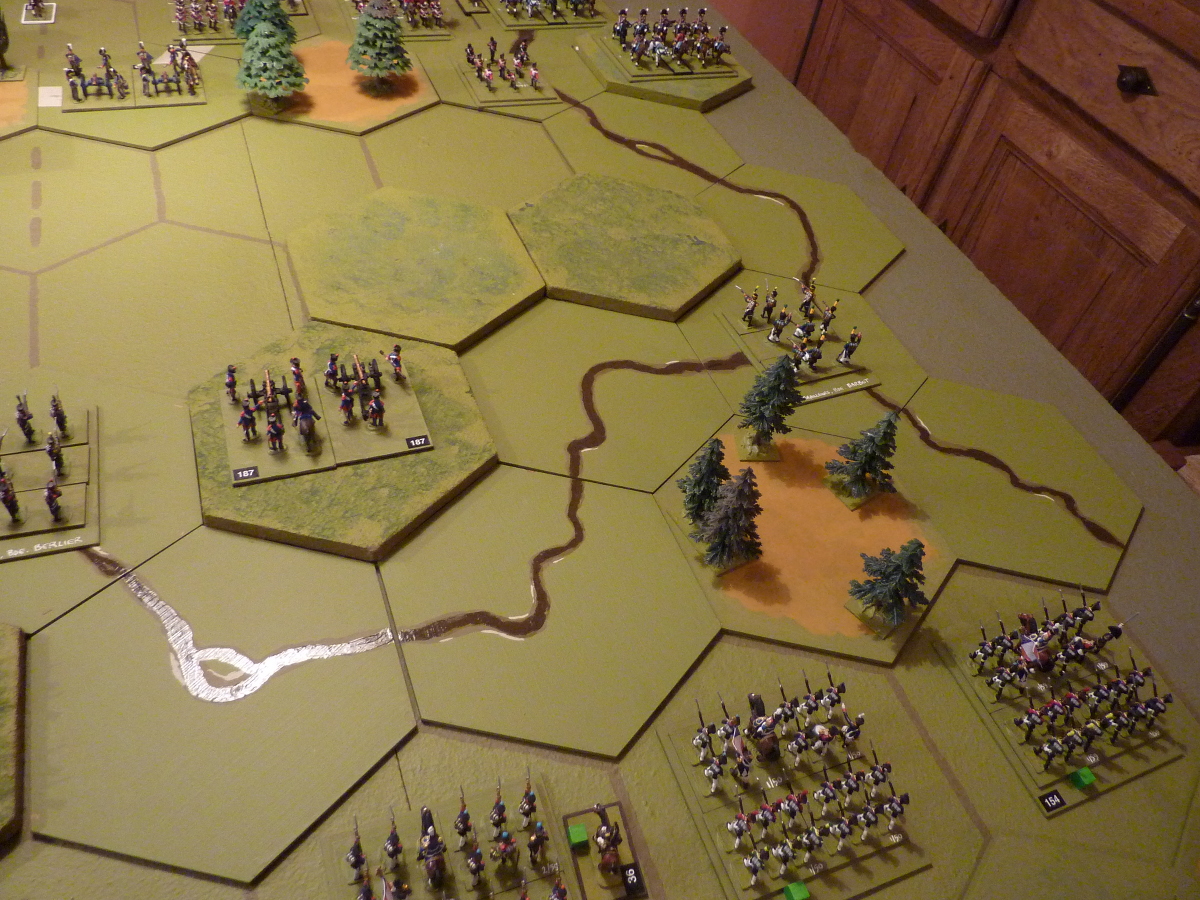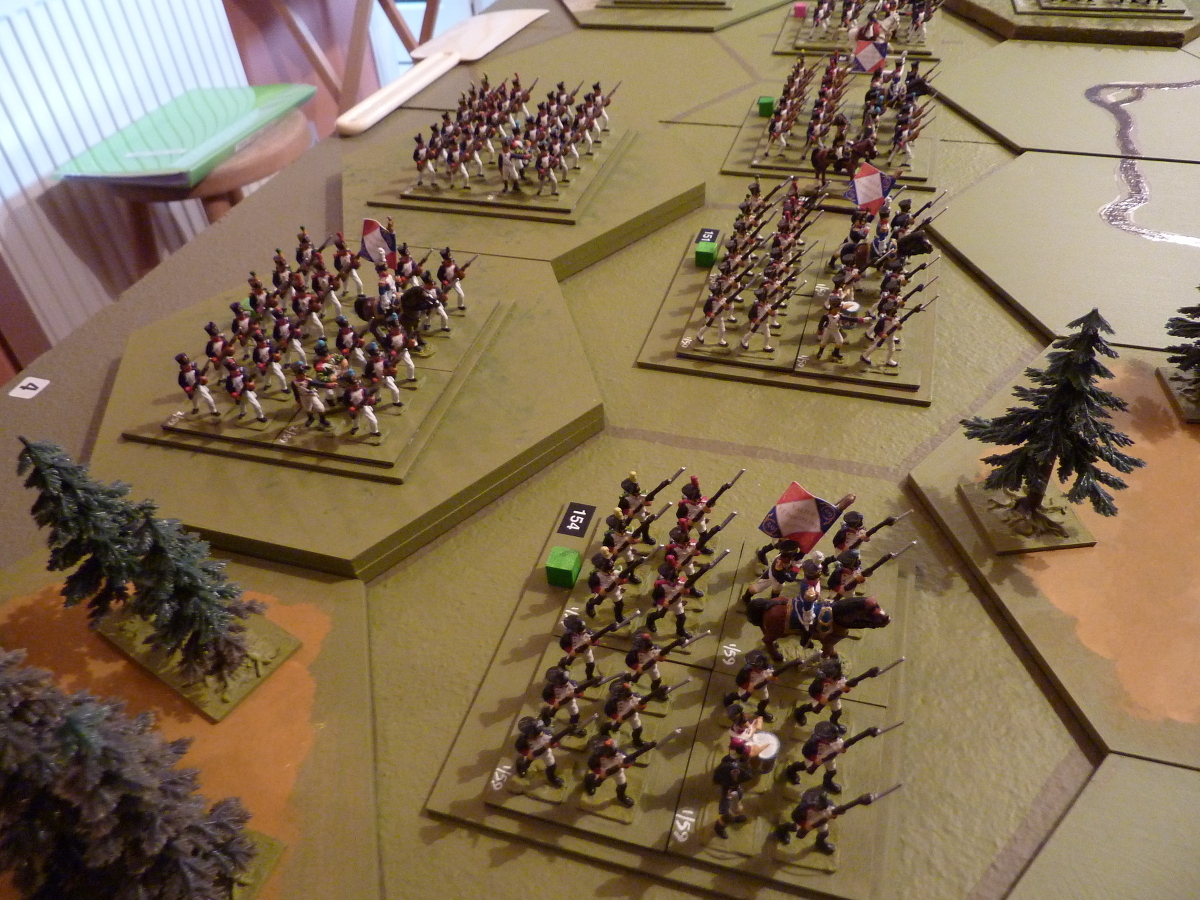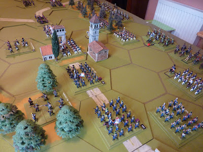 The particular things I'm testing at the moment are the continuing prototype of my "brigade activation" tweak, which enables groups of units to be ordered at one go, and the use of bodies of converged light infantry/voltigeurs as Commands & Colors-style light infantry (i.e. a representation of skirmish-order troops in a grand tactical game format).