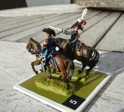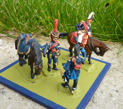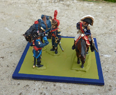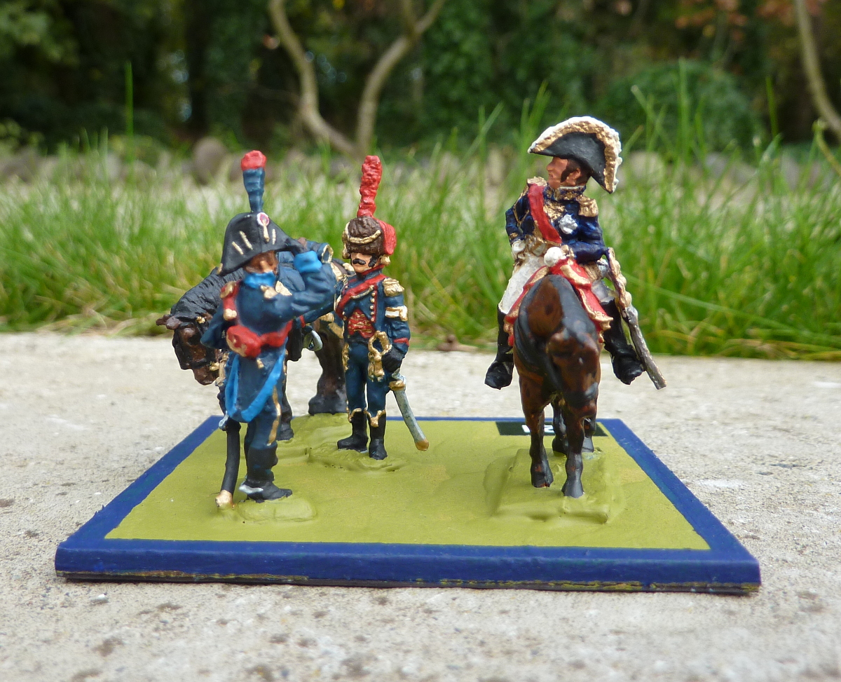 Sanity check - I could set up a whole series of celebrity generals to make guest appearances as appropriate - some of them wouldn't get out to play very often. Thus I have made this fellow rather more generic - the ADC in the blue and red (the guy with the horse, for the colour-blind) is wearing the regulation uniform for the ADC of a Marshal-who-is-not-a-Prince, and the man who is saluting is a visiting ADC for a General de Division, so it's all pretty much vanilla. I shall probably use this group as Suchet if the occasion suits, but otherwise other choices are available. Good.