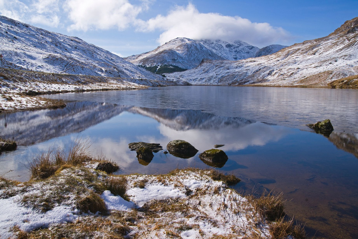 Here are some suitably frosty photos of the Highlands of our beloved Scotland (borrowed from a couple of hikers'/photographers' websites I'm fond of), and the scene in the Great Hall here at Chateau Foy as we get ready for the festive season.
