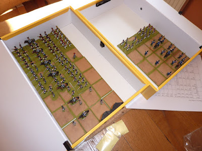 When a unit is actually complete, I finish off the bases, supply an official 110mm x 110 sabot, give 'em a flag, and they move from the box-files to The Cupboard, ready for warfare. Snapshots of this morning's state show two box-files in use - one for the Hinton Hunt and Der Kriegsspieler battalions and one for the Les Higgins battalions. The figures are not incompatible, but I keep them separate for historic reasons which are a bit dim and distant now.