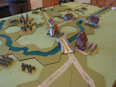 This time, the Prussians went for Plan B, which was to arrange for the East Brigade to get back over the river to the southern bank, join up with the South-West chaps, and attack the village in the approved manner. We actually gained just a little success this way, but not enough - we lost again, though this time the score was 6-3. You may decide for yourself if this is a worthwhile improvement.