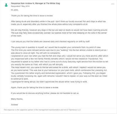 After telling the story to the Contesse, the other day, I decided I would do some Internet poking-about, and see if the pub is still open. I forgot about the matter for a couple of days, but this morning I remembered, and I find that the pub - at least nowadays - is The White Stag. It looks quite nice, in fact - I'm sure it's been under new management for decades now. While I was surfing, I came across a bad review of the place on TripAdvisor - pretty spectacularly bad, in fact - and I came across a pretty heavy response from the current owner - I attach them here, in case you find them as entertaining as I did.