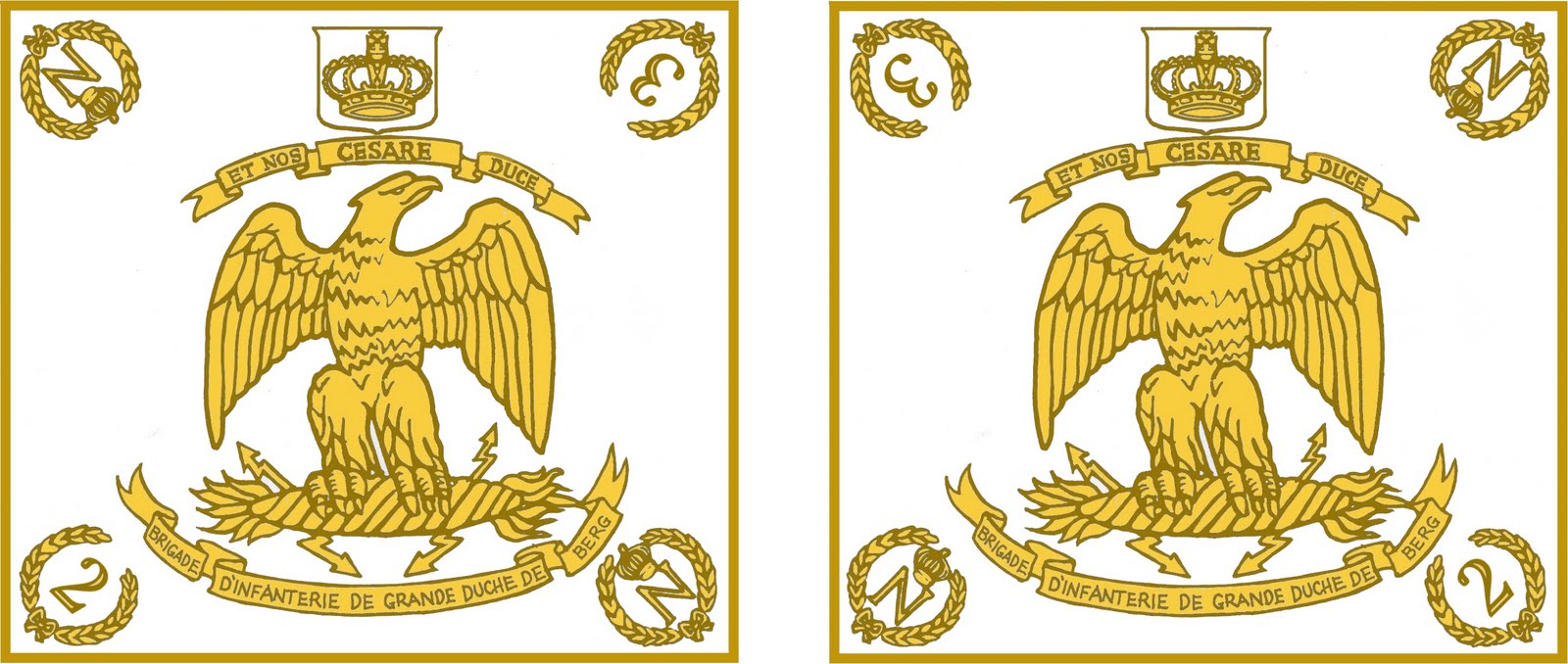I wasn't keen on the available downloadable versions of Berg flags from the usual sites, so I constructed my own, for better resolution. This is the post 1809 version of the flag - I have printed mine at 18mm high for 1/72 scale, which looks OK, but I confess that I have no idea what size they were really. It was just gold on white - a lot less attractive than Murat's pre-1809 design, but you'd expect that. All units had the same flag, just overprint the numerals in the corners.