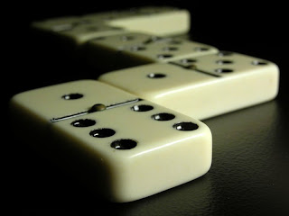 Game is thus. For 2 players, each takes 10 tiles - rest go face-down in the boneyard. Starting player (winner of previous game, or reigning champion, in our house) plays a double of his own choice. If he has no doubles, the other player starts. Play proceeds in 4 directions from this initial double, but there is no need for all 4 directions to be played. No number may be played until the double of that number has been played, so at any moment numbers are "open" or "closed". If you can't play, you may pick up one tile from the boneyard. If you still can't go, you pass, or "knock" (or "chap" if you are in Scotland). If you play your last tile, you have won. If no-one can play then the player with the "lightest" hand (least spots) wins. If the spots are equal, the players go outside and fight to the death with knives. I made that last bit up, to see if anyone was paying attention.
