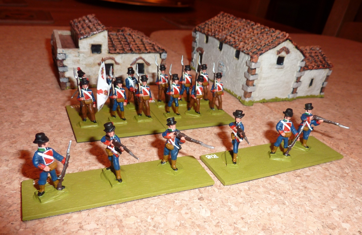 Having replaced my congealed red paint, I've now finished the first of my new units of Falcata figures. Here are the Regimiento del Ribero - also known at different times as the Voluntarios del Ribero and even as the Cazadores del Ribero. Whatever, they are light infantry. These are all pre-production castings from Falcata - the skirmishers are my own conversions - Spanish regular light infantry with militia heads.