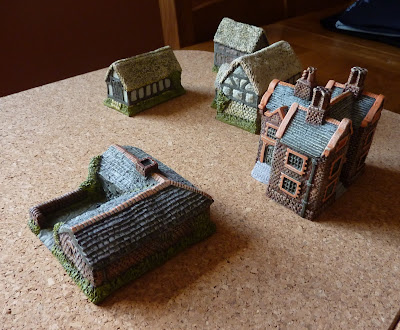 Better today - going into Edinburgh to see a concert tonight, armed with sucky sweeties to avoid my coughing the acts into silence. On the hobby front I've done a few lightweight organisation chores - fitting out more A4 box files with steel paper - stuff like that - and I've continued to work away at my supply of 15mm buildings for the ECW. Steady progress continues, though I may eventually convince myself to do a little re-work to tone down a couple of my paler thatch roofs. These little Hovels castings are really nice to work with, though I'm finding the finished buildings are a bit of a nuisance to store safely.