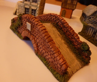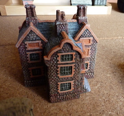 As I've progressed through the stock of unpainted resin over recent weeks, I did a lot of checking with the painted examples on Hovels' website, to see how they are intended to look, and as my confidence has grown I have found that I am frequently setting about doing something different. In particular, since my intended theatre for the ECW is the North West, I've had a go at producing some buildings which are a bit less obviously Cotswold Stone than standard. I am pleased with the little brick smithy shown here, and especially with the Bunter Sandstone mansion house, though it does bother me a bit that it looks like a childhood memory of Rathbone Road school in Liverpool - if it had bright green railings it would be the complete thing.