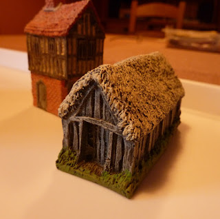 In fact, painting the Hovels buildings is a delight, because the sculptor has made such a nice job of them that all you have to do is identify what is there, and let it emerge by itself - the rougher the dry-brushing the more building-like will be the results. The half-timbered houses appear to come in two types - one is the expected finish, with the gaps between the beams plastered, and the other has the gaps filled with wicker, or maybe it is wattle-without-the-daub, choose your nomenclature.