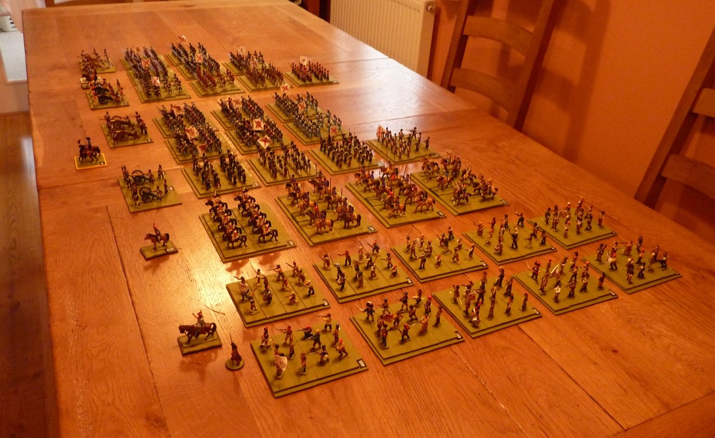 The structure is based on two infantry divisions, each consisting of two brigades of regulars plus one of volunteers and militia. The cavalry is short of a couple of units, which are likely to end up as some form of variegated hussars (though they will probably be nominally cazadores or mounted grenadiers). To the right of the rather informal collection of cavalry you see a couple of brigades of full irregulars (and fine chaps they are).