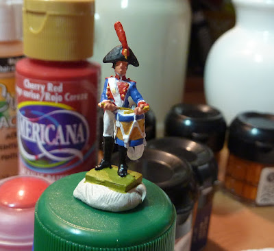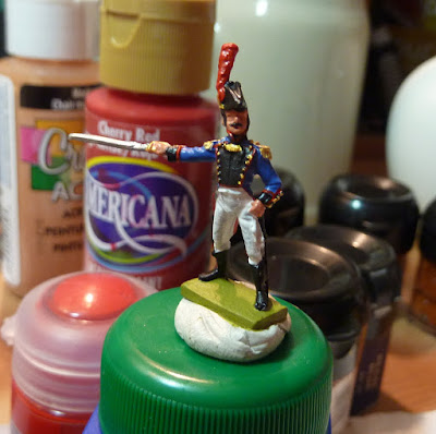 Another little group of command figures emerges, blinking, into the bright lights. This is an example of the classic 1805 regulation uniform. Ordenes Militares were the 31st line regiment of the Spanish army; like Navarra (24th), America (26th) and Jaen (30th) they had dark blue facings, but the configuration of white lapels, blue collars and white metal buttons identifies them uniquely. I'll get their flags printed up during this next week.