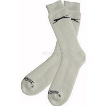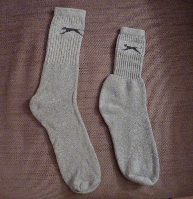 Evidence. Here are two of my new socks. They are identical, apart from the fact that the one on the left is fresh from the pack, unworn, and the one on the right has been worn and washed a few times. The socks are badged Slazenger, as you will see, but I am confident they come from the same Far-Eastern factory with a variety of brand logos. What is going on? - some fiendish foreign plot? Little wonder I have been having problems - I am astonished that I haven't spotted this before.