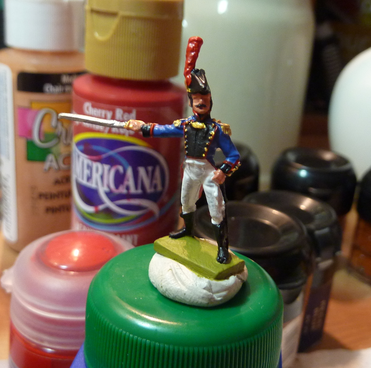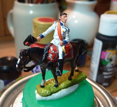I notice from my photos that my matt varnish seems to be getting a bit shiny - better start a new bottle. It's OK, the overall effect is a light sheen rather than a hard gloss, and I like the toy soldier look. The lighting makes it look worse than it is.