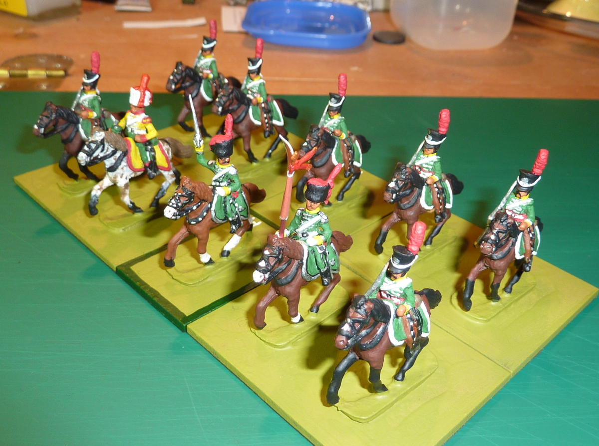 They have a proper campaign history - the unit fought at Ocaña and elsewhere. By 1810 they had become the Husares de Fernando VII, and pelisses were added to the uniform. In my army they'll be brigaded with the mounted cazadores and the husares, which is where they rightly belong.