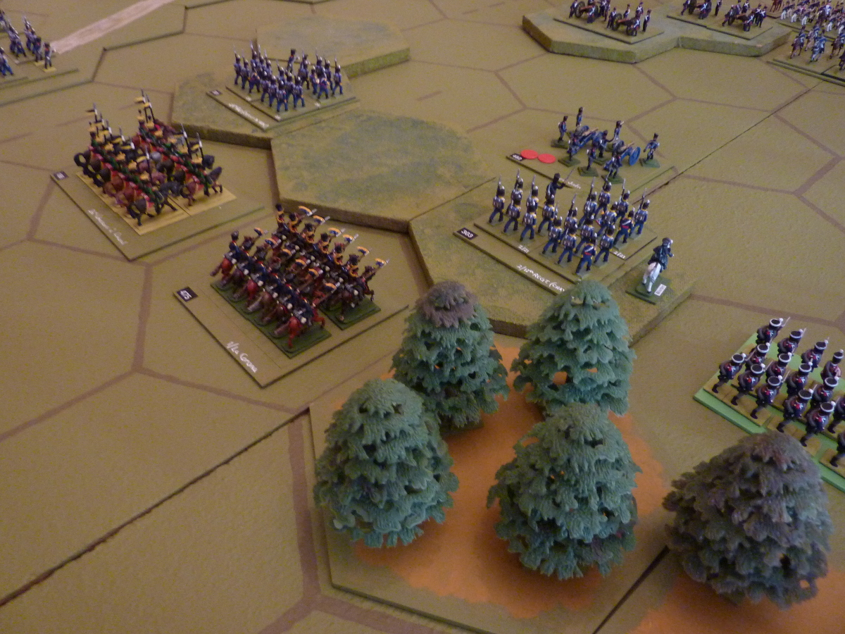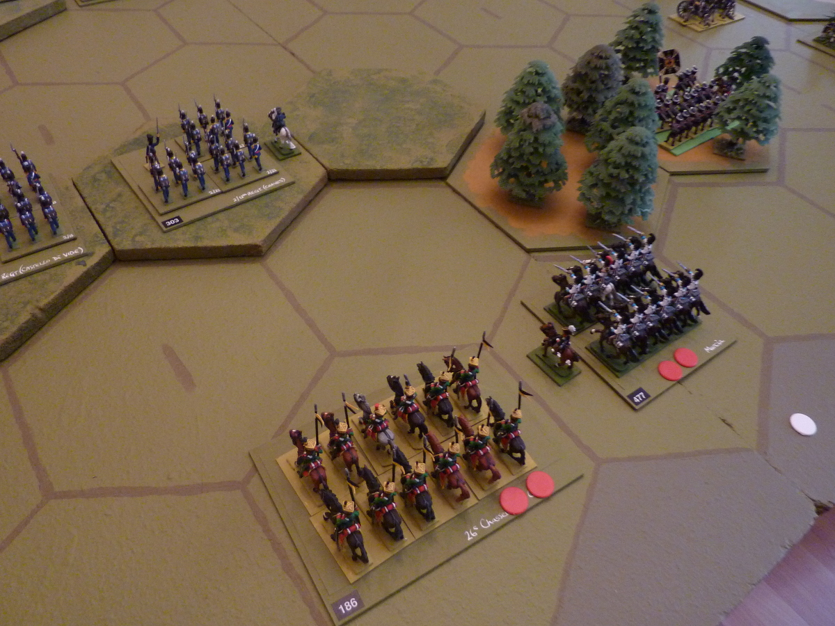 Action on the Prussian left - a brief glimpse of the legendary French 15eme Chasseurs à Cheval (on the road) who did not manage to live up to their celebrated success at Talavera |