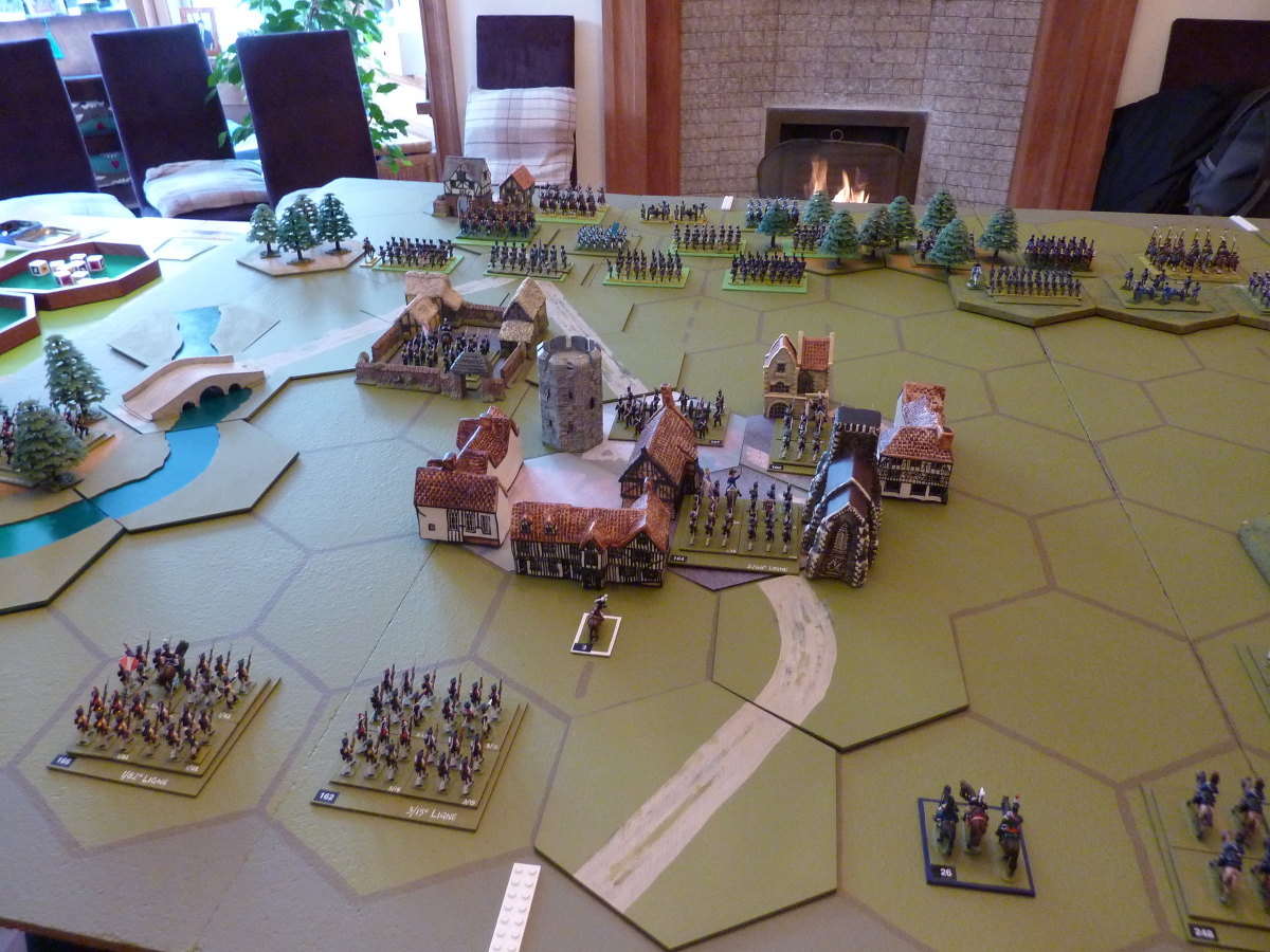 The village, with its outlying walled farm, seen from the French side, with the little village of Wahren on the far edge (featuring a town gate which I like, and which doesn't get played with very often, on account of the clock in the tower being a poor fit with the ECW). General Lagrange is already practising his hat-waving act, just this side of the village (with the white border to his base). |