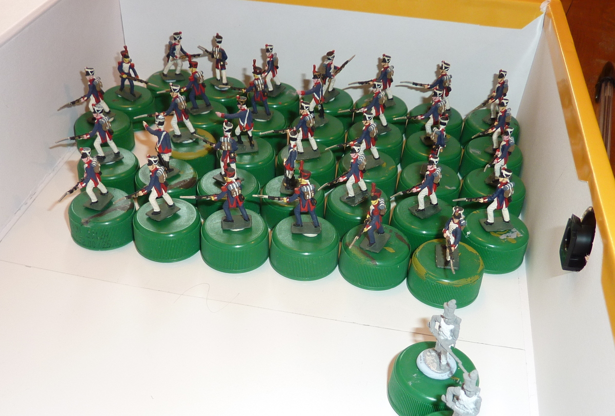 Righto. Gave them a soak in a mild detergent bath for a couple of days. Got rid of the cardboard bases and washed them carefully with a soft brush. Stuck them on the green bottletops. First thing I don't like is that the line infantry all have red turnbacks. Easily fixed, except that it will take two coats to cover the red with white, there are a lot of them and - as soon as I try one - I realise that the overall trousers are very yellow next to the fresh white. OK - I'll paint the trousers as well.