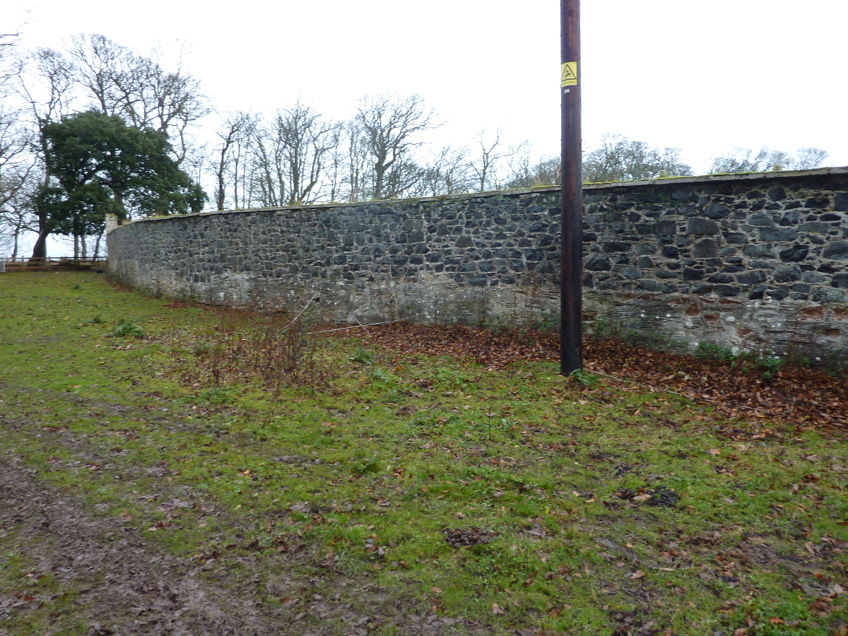 An aerial photo of the area from a few years ago; on the left of the picture you can see the D-shaped Walled Garden, which once was a market garden with greenhouses, but is now pasture for the horses. This D-shaped field can be identified on Roy's military map of Scotland, 1747-55. The back wall is the one near us, close to the woods, and the cable is on this side of the wall. The tree which caused the extra damage is dark green, on the left edge of the photo. The place certainly doesn't look like this now, after the trees were flattened. The photo is facing almost due North