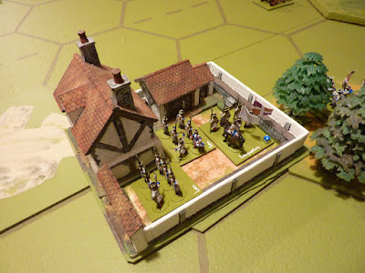 In very short order, the Aufseß Dragoons were dislodged again, but this time were sufficiently discouraged to fail the requisite Rally Check, and they disappeared into the distance. The new occupants were the Régiment de Languedoc - one VP changed hands on the spot as the farmhouse was captured, and of course another VP was allocated for the vanishing dragoons.