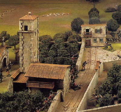 The approach, as suggested by Charles Grant and Charles Wesencraft all those years ago, is that a small cluster of buildings on the battlefield is intended to denote an unspecific built-up area occupying the same space. Unless it is a skirmish, the buildings can be moved around a little to make room for the action, and there is no question of arguing about exactly how many men can occupy a particular building (unless, of course, it is historically necessary). The men are either in a village or not in a village. How they deploy to occupy it is beneath the resolution level of the game.