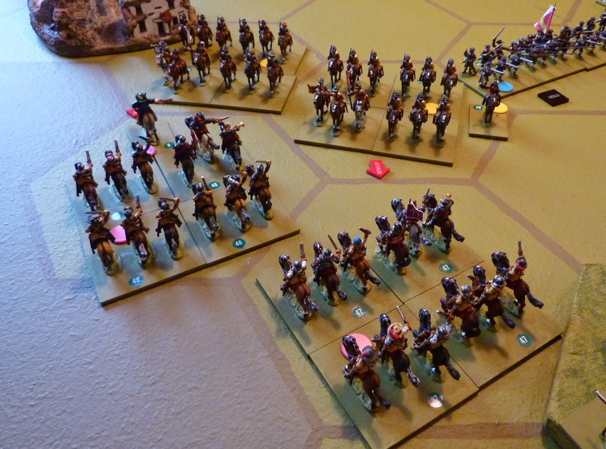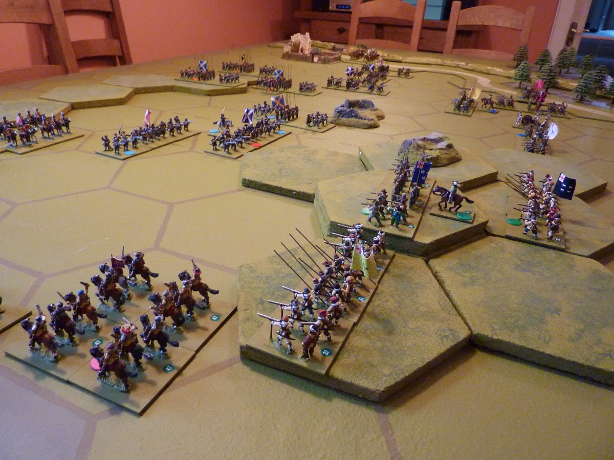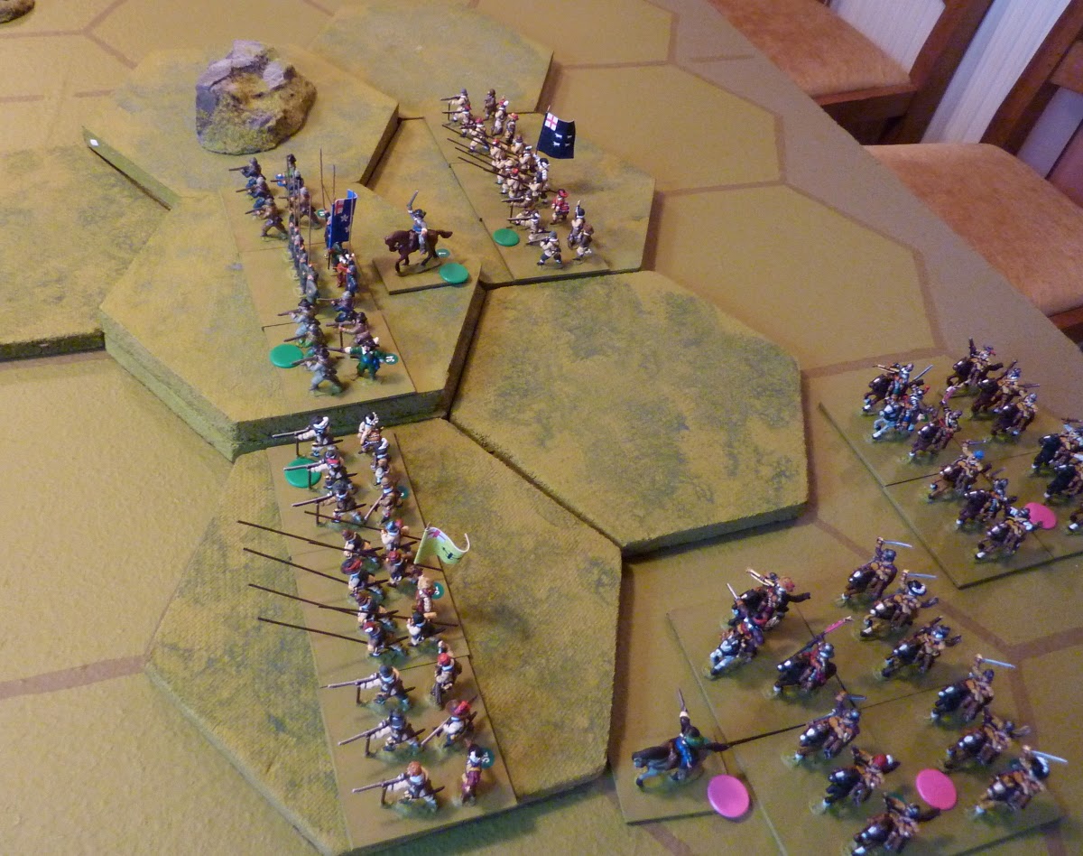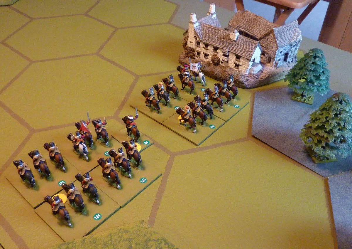 | Darracott was determined to hold his cavalry back, but the dice determined that Broadhurst, on the Royalist right, saw an opportunity to harrass the flank of the Parliament attack |