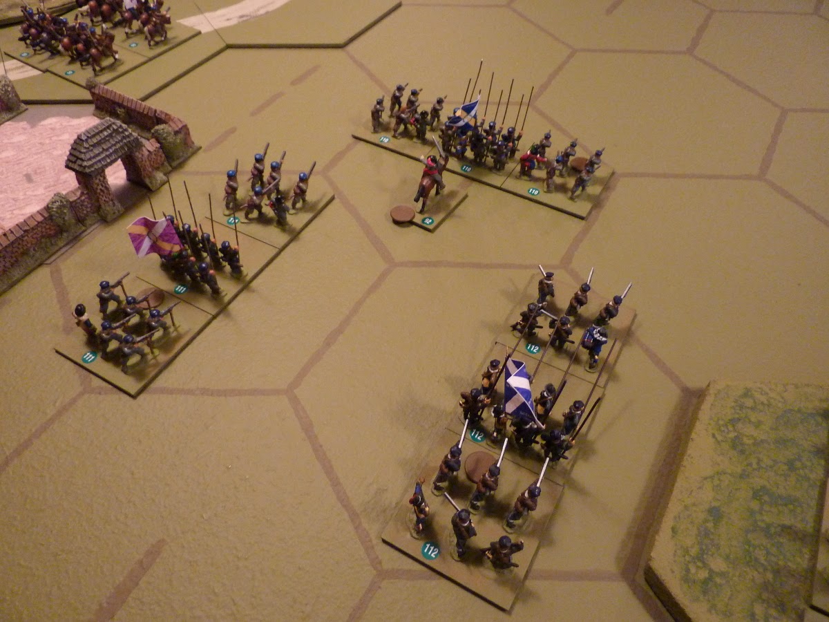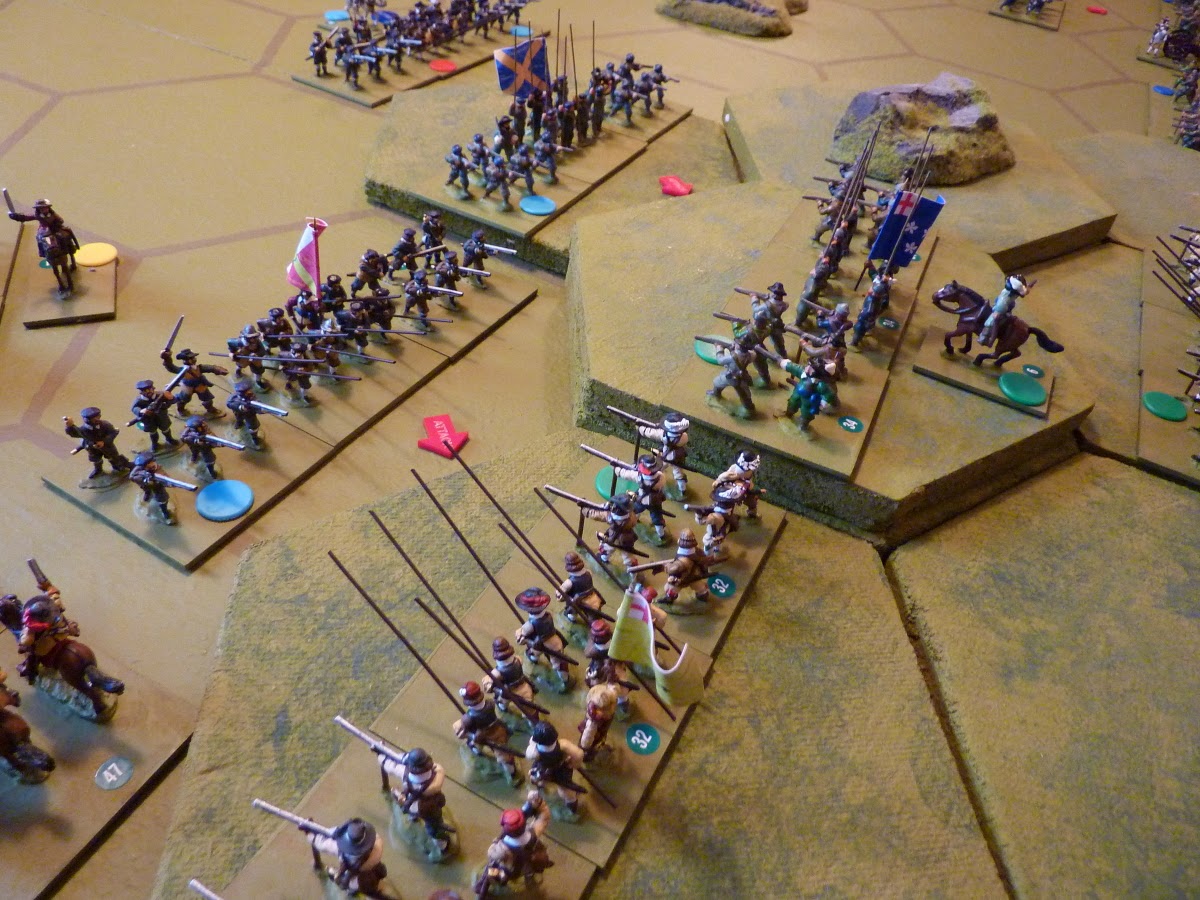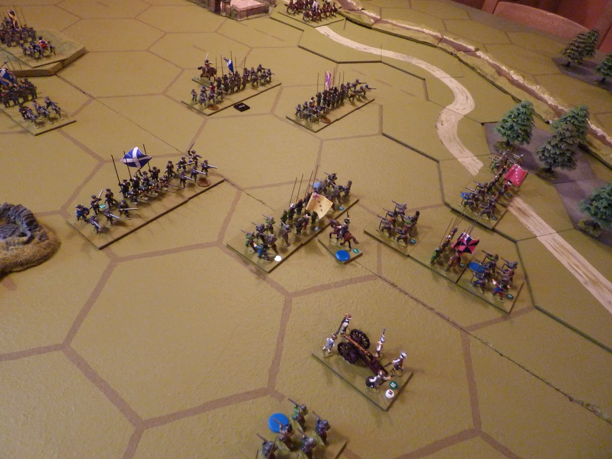 | Darracott was determined to hold his cavalry back, but the dice determined that Broadhurst, on the Royalist right, saw an opportunity to harrass the flank of the Parliament attack |