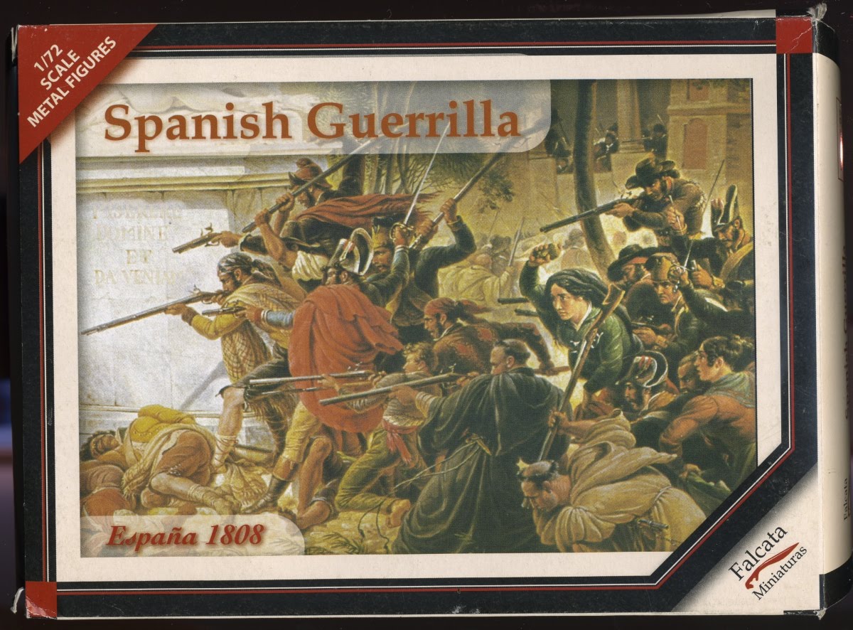 Now I have another unexpected triumph to relish. Somehow, my worldwide network of dodgy contacts has managed to trace two boxes of the out-of-production and unobtainable Falcata Spanish Lancers, and these have now arrived safely in the post from Vigo. If this event appears underwhelming, bear in mind that I have never seen any evidence that this set ever made it into production, so I never expected to see such a thing. They also will join the painting queue. There are two "uniforms" in the set, thus - if I ignore the falling man in each box - I should be able to form two units of lancers (one will be Julian Sanchez' Lanceros de Castilla, the other is a much more irregular unit in sombreros). With the leftovers, if I arm them with swords and blunderbusses and generally paint them all the shades of brown in the rainbow, I have the option of producing some mounted guerrilleros. The lancers, by the way, come without lances, so I will have to provide brass wire ones.