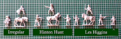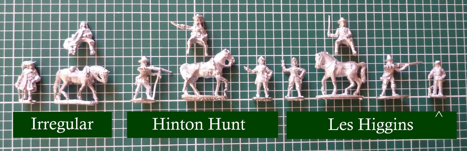 My WSS armies are primarily Les Higgins/PMD 20mm from the 1970s - small figures - 20mm to the eye. Only Irregular will work with these; plastics are too big, as are the very nice 1/72 metal offerings from Minairons and Hagen. I reckon the Higgins boys are about 1/76, in old money, and in this scale a millimetre on the hat brim size is very obvious. Fine visual tolerances. I have been talking myself up, therefore, to use Irregular, and there is a value-added pinch to this, since I could use some of my spare Irregular horses, which are appreciably smaller than the Higgins horses I use throughout this project. Robert Hall says that French dragoon horses were normally about 12 hands, as opposed to 17 hands for cavalry horses, so this is looking like a sensible possibility.