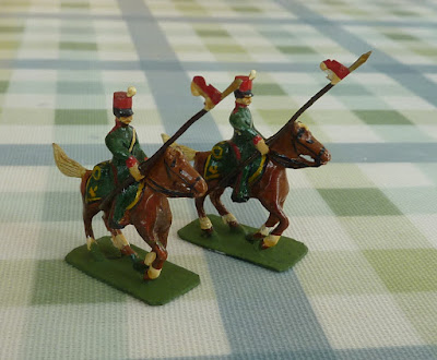 So, having established that there are some (tweaked) G&Bs present, here are a couple more - this time dragoons, again with sheet metal bases. These figures are very slightly tall and lean in comparison with Hinton Hunt (for example), but fit in reasonably well, as the pictures show, so - if you are more knowledgeable than I am about G&B (and most carbon-based life forms are) - then you can have a guess what period and range these come from. They seem too big for the three-quarter-inch diorama series. Anyway, G&B they certainly are, and 20mm too.