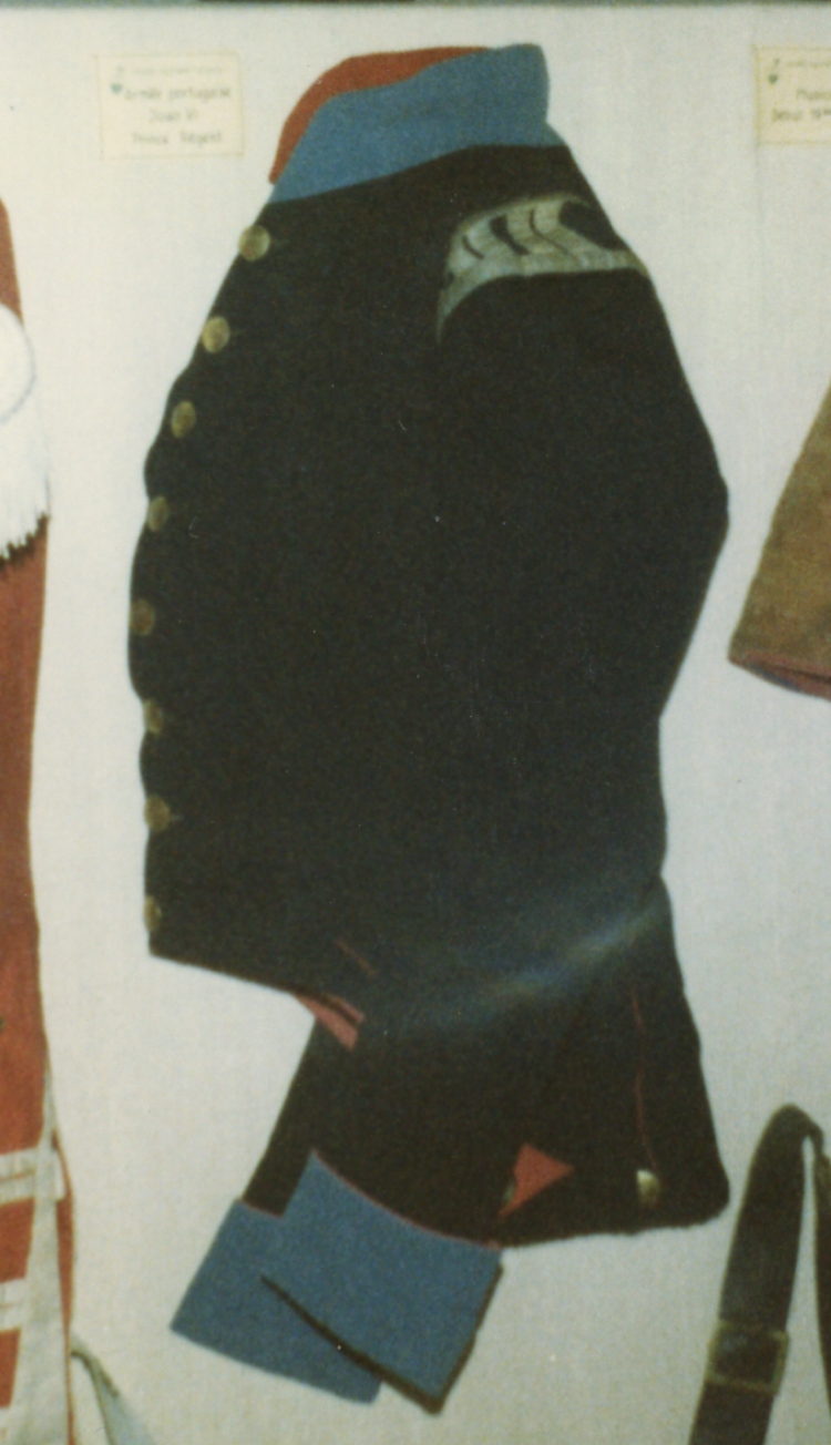 Bradford's book includes plates of relatively familiar Spanish and French subjects which demonstrate that he was a skilled observer, and recorded what he saw. The cavalryman has his side plume removed, and the wide front stripe of piping colour is unusual, but we get the idea - there is no cause to doubt its authenticity. While on the subject of ancient history, here is a photo I took in 1981, back in the pre-digital days when poor holiday snaps really were poor, at the little military museum in Morges, Switzerland. The exhibit was described as a Napoleonic Spanish coat, but the button inscription (P. JOAO VI PRINCIPE REGENTE) and the style of the jacket identify it as Portuguese, the facings (sky collars and cuffs, red lining) being those of the 11th cavalry. The wings are odd - maybe a later addition, or a trumpeter's ornament?