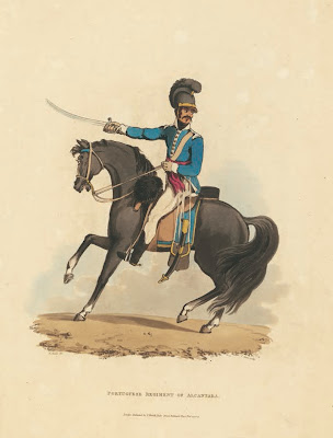 So I fell back on the safe and well-tried option of doing nothing at all about it. Portuguese cavalry (with all due respect) was not usually effective in a battlefield role, so could be a lowish priority anyway, and - anyway - I have not always been entirely comfortable that I knew exactly how these guys were dressed. There was the strange sky-blue uniform on the cover of Otto Von Pivka's old Osprey book, which I believe is probably incorrect (though it appears to have influenced GMT's counter artwork for Commands & Colors: Napoleonics), and there was a wide range of interpretations of the appearance of the helmet. The headgear situation is confused by the fact that the Legion d'Alorna wore something very similar to the helmet of a French line lancer, with a high crest, while there are descriptions of cavalry units in the Portuguese army equipped with British equipment, including, apparently, Light Dragoon-style Tarleton helmets.