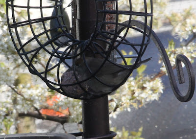 | Mrs Blackcap is a little more shy - she's just visible inside the fat-ball cage, with a performing Bluetit trying to attract attention at top left |