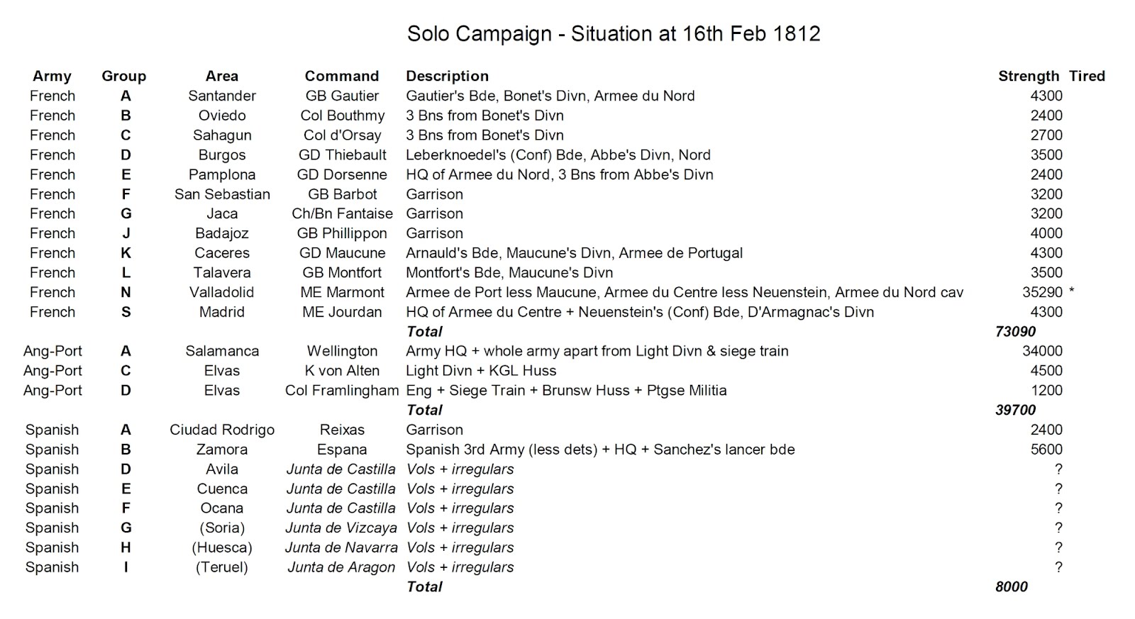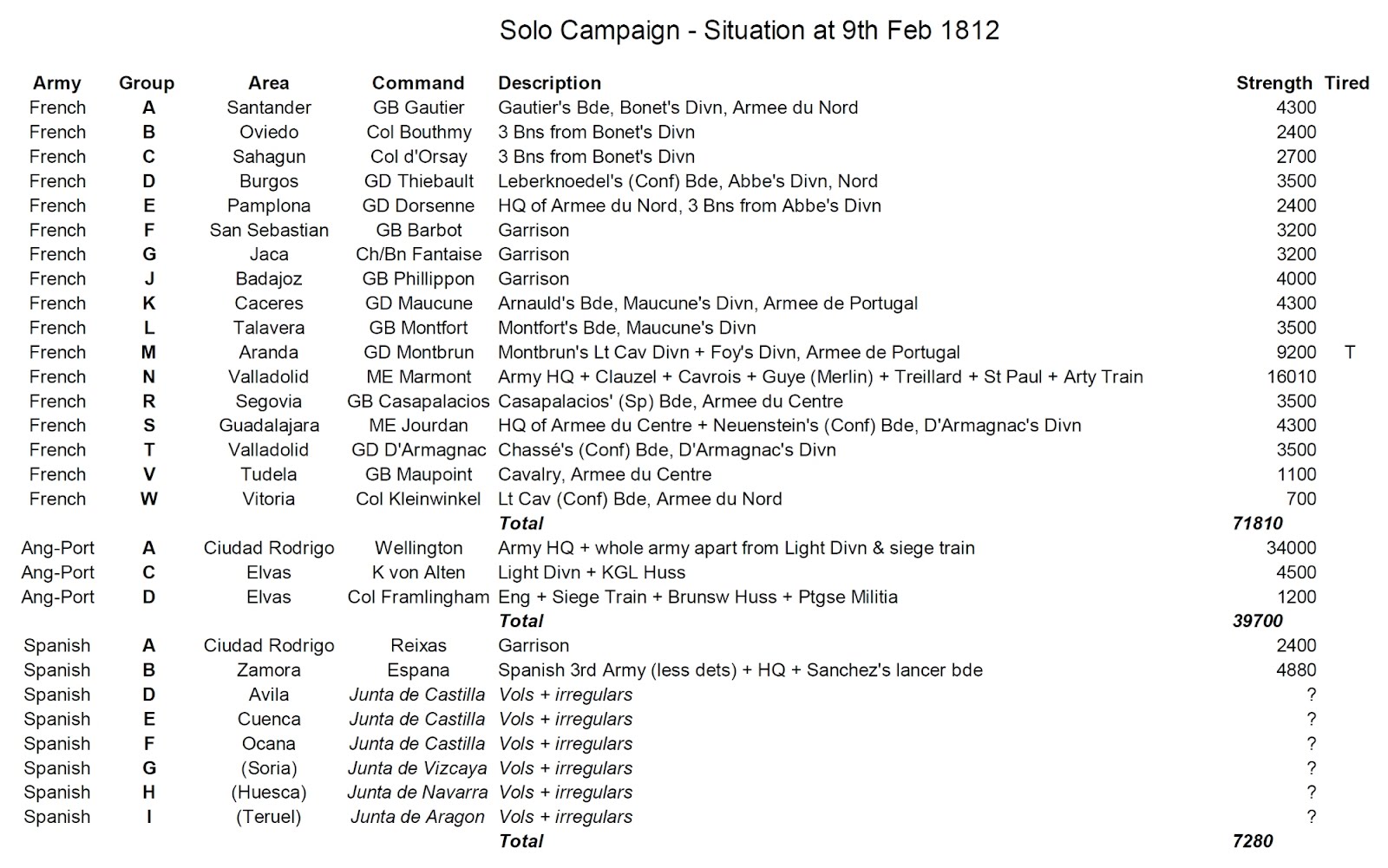 Wellington, with his own and Hope’s contingents, now has some 34000 men at Ciudad Rodrigo – this is basically full Anglo-Portuguese army less Light Divn. Marmont knows he is there, but has few details. Because of civilian support, Wellington has a good knowledge of Marmont’s force, though he underestimates its strength somewhat.