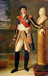 General Clarke (Duc de Feltre), Minister of War in more jovial mood. Though he has a marshal's baton here, he was only made a marshal after the Bourbon restoration. Also of interest in the picture is the fact that he is obviously rehearsing his legendary after-dinner ventriloquism act - he used to say to the bust "What do you think of it so far?", and the bust would be seen to reply "Rubbish!". This was a great favourite of the Emperor's, and he would always laugh uproariously.