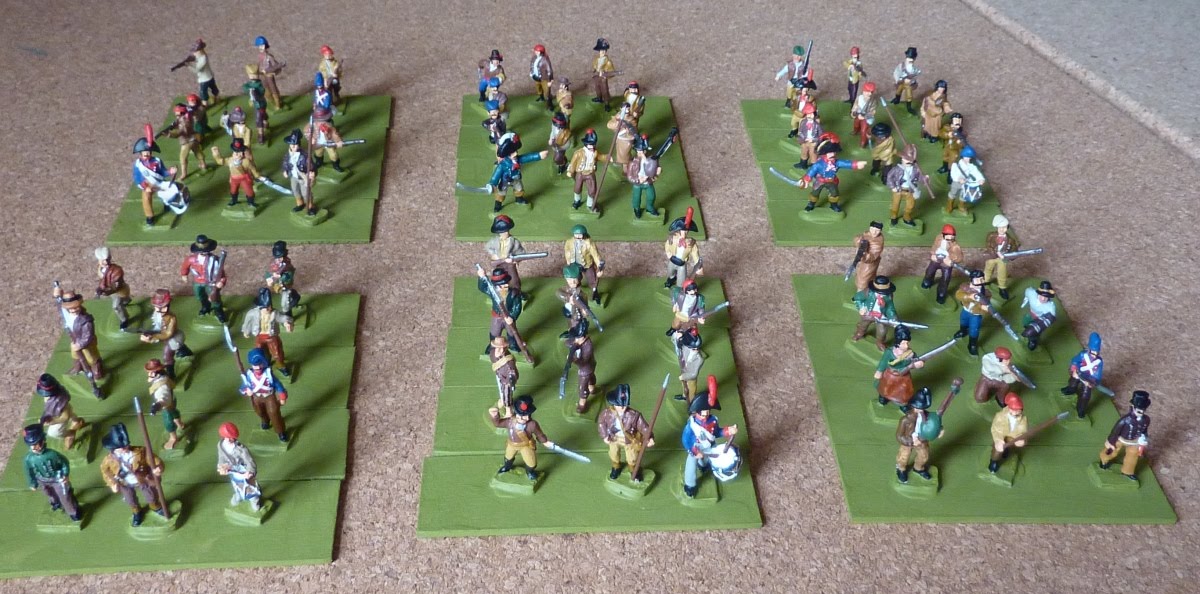 Ludovico also wanted to see a picture of all the guerrilleros together, so here they are. The 4 "battalions" at the front are mostly a mixture of Qualiticast and Kennington, the remainder are the ones I pictured yesterday (though they now have flags and sabots), and they are almost all Falcata. There is also a mounted unit, but I forgot to include them [sorry, Ludovico]. The Falcata figures, being just a little taller, are on 2mm plywood bases, while the others are on 3mm MDF. This is what passes for house standards here.