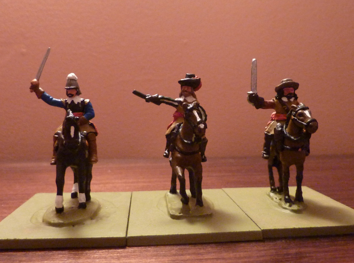 OK then – I’m happy enough. The last picture from this episode is to show what I set out to prove in the first place – that three figures from three different manufacturers, each on the correct horse from the corresponding range, are fine together. Painted up, they are all happily and comfortably 20mm brothers – they can exist in the same world and on the same tabletop without awkwardness. The variety of style, indeed, becomes a strength.